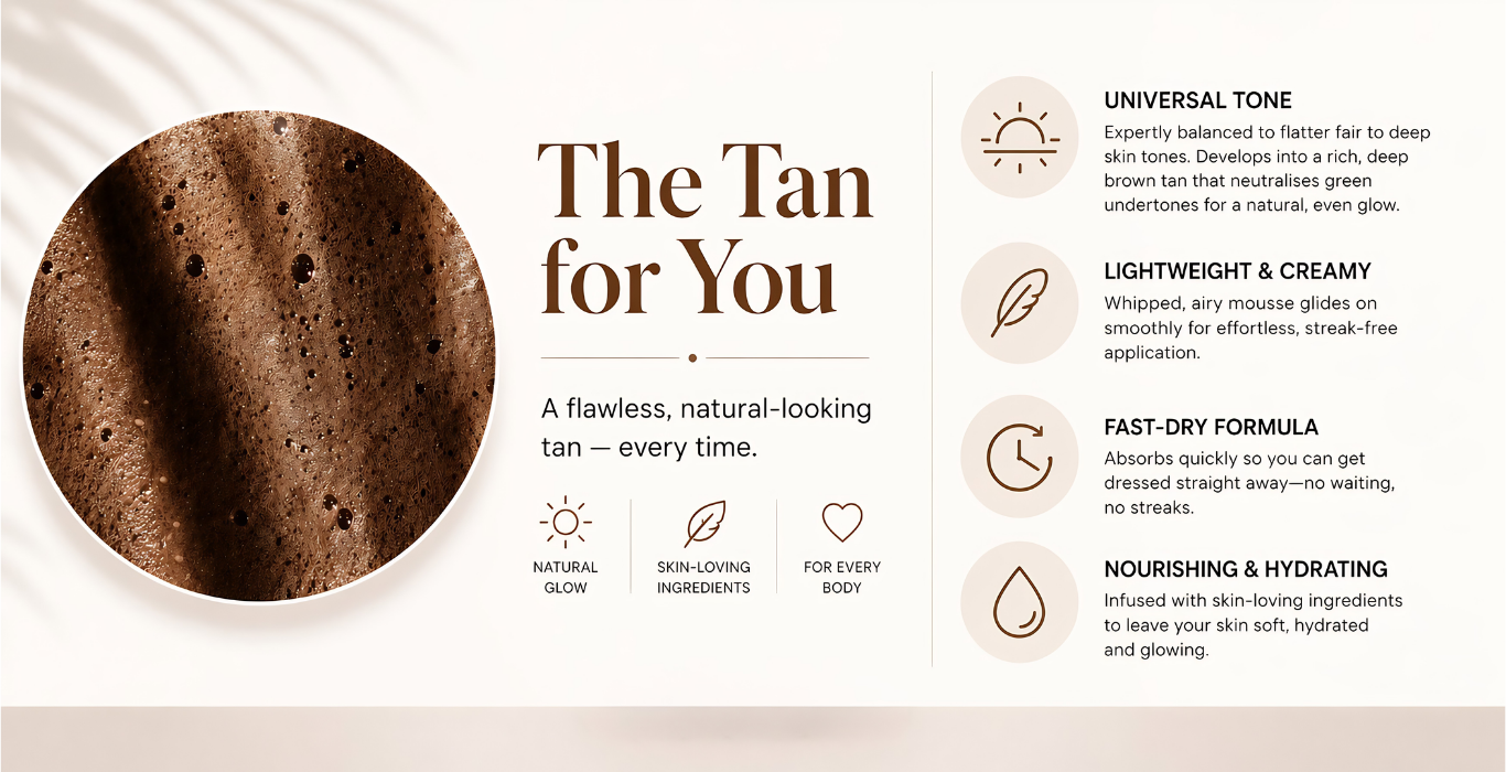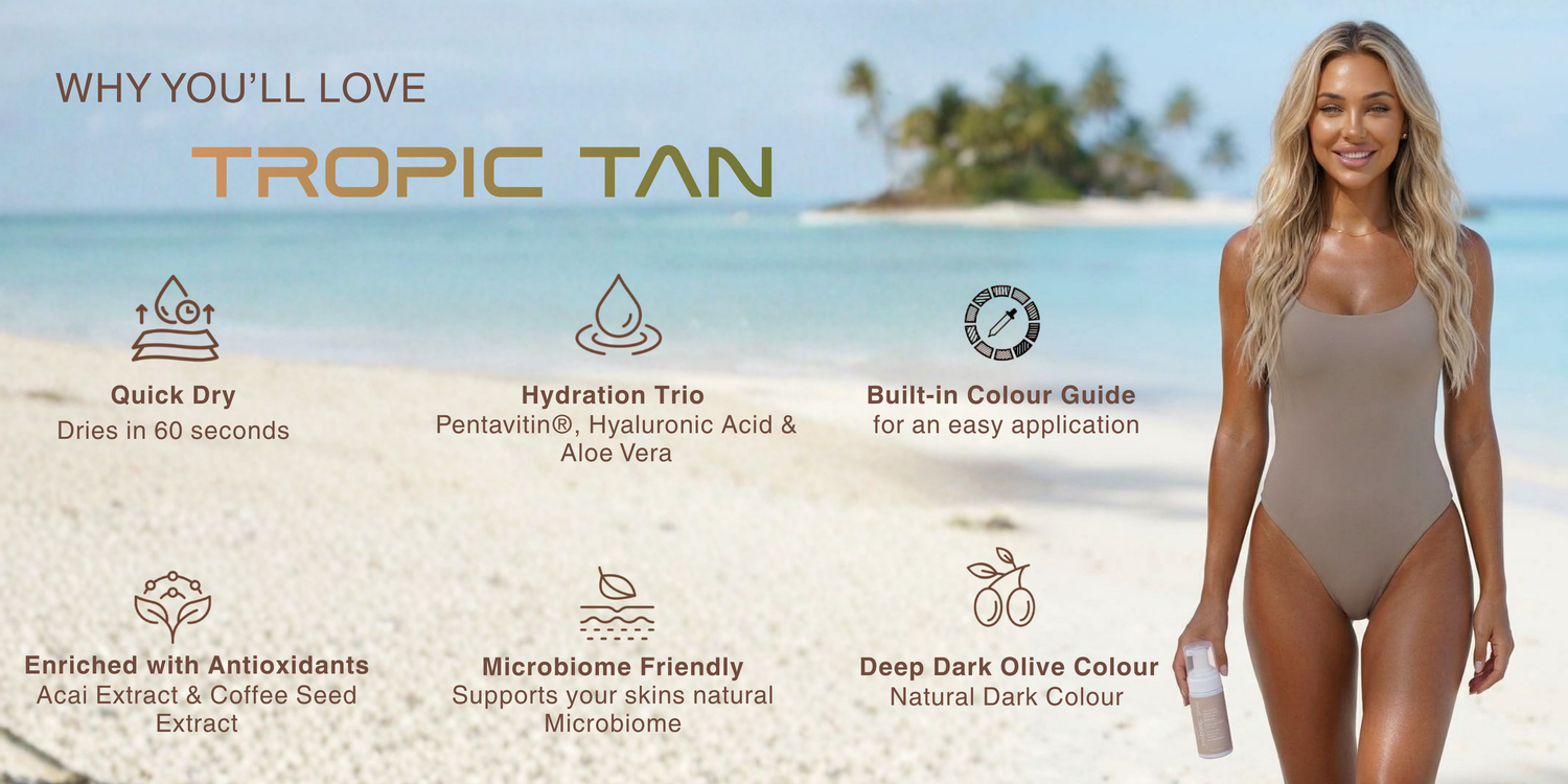 Self-tan has entered its skincare era. Tropic Tan lasts longer because it hydrates your skin. Dry skin sheds. Hydrated skin holds your tan.