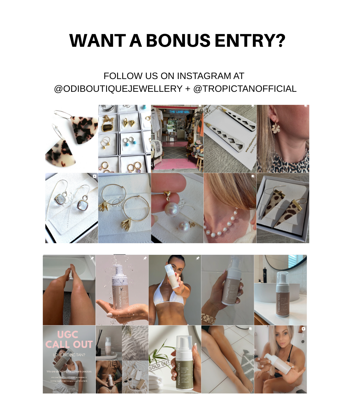 Additional entries may be earned by following @Odiboutiquejewellery @tropictanofficial on Instagram, as outlined in the giveaway instructions. - Competition Period